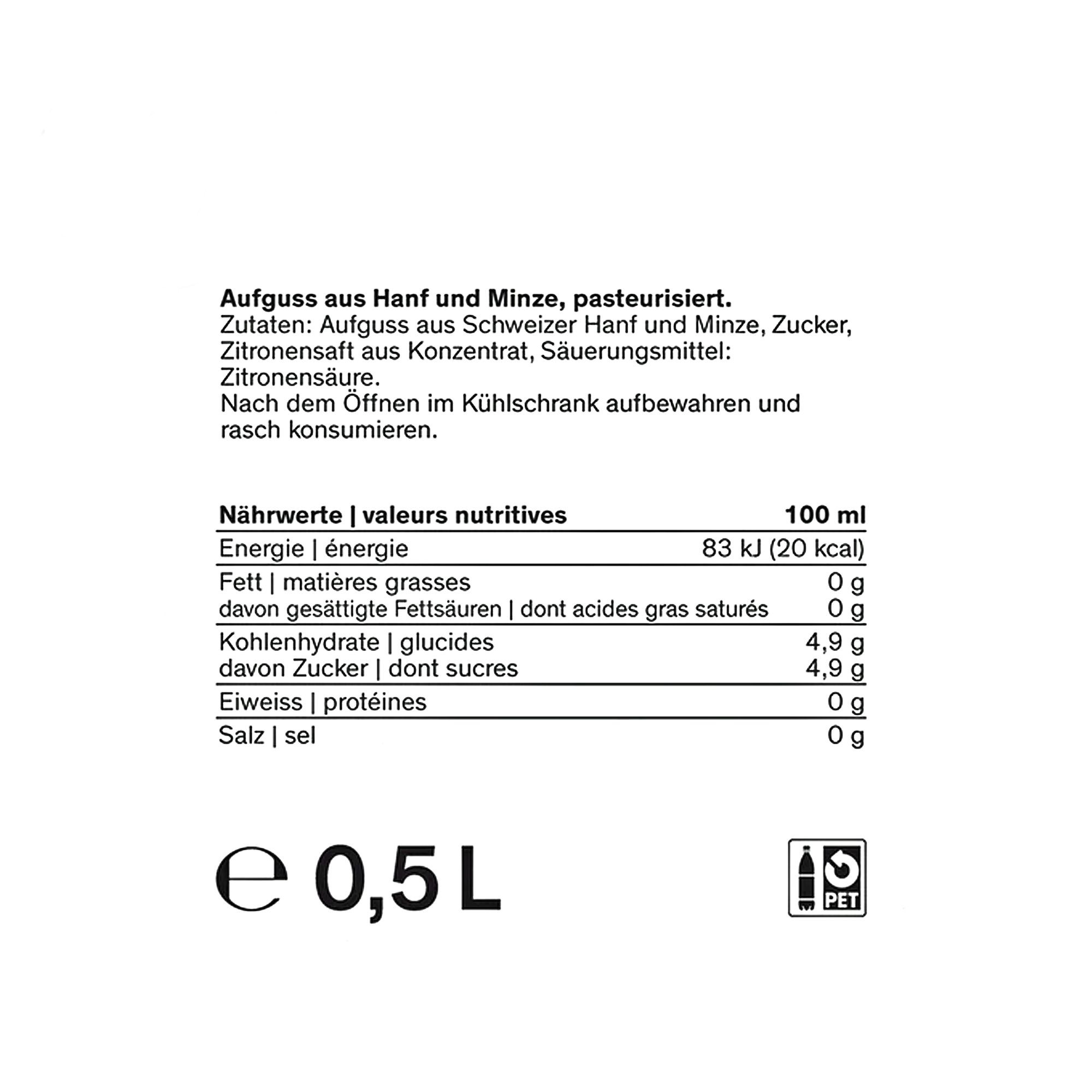Der Heimat Fresh Cannabis Ice Tea ist ein Premium-Eistee aus einem Aufguss aus Schweizer Hanf und Kräutern, Zucker, Zitronensaft und Zitronensäure. Er beinhaltet weder Schwarztee noch künstliche Aromen.